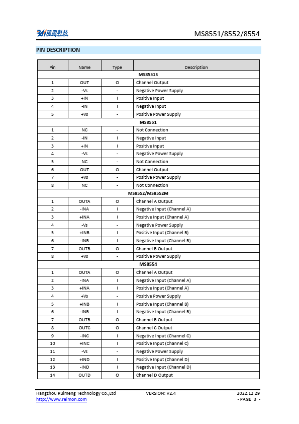 The MS8551/8552/8554 is a rail-to-rail input and output, highprecision operational amplifier.