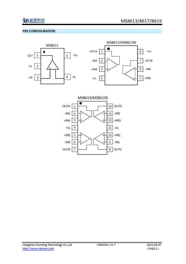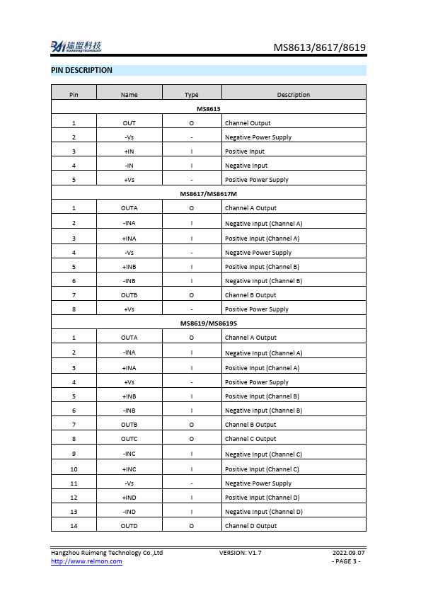 The MS8613/8617/8619 is featured by ultra power dissipation, rail-torail input and output, low input voltage and low current noise.