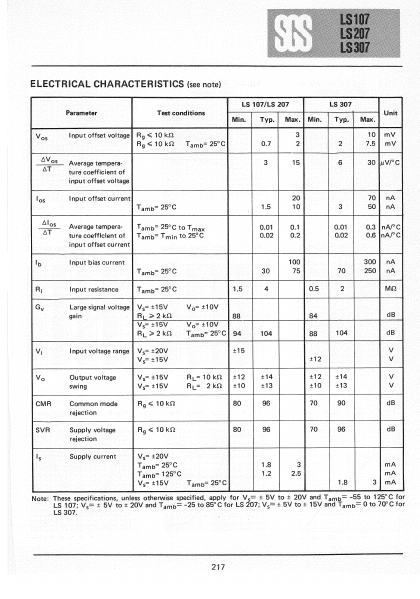 LS107 LS207 LINEAR INTEGRATED CIRCUITS LS307 FREQUENCY PENSATED OPERATIONAL LOW OFFSET CURRENT A N D VOLTAGE LOW INPUT CURRENT GUARANTEED DRIFT CHARACTERISTICS AMPLIFIERS The LS 107 series consists of general purpose operational amplifiers, w ith the frequency pensation built into the chip. They replace p i n - t o - p i n the LS 709, LS 101, LS 141 and LS 148.