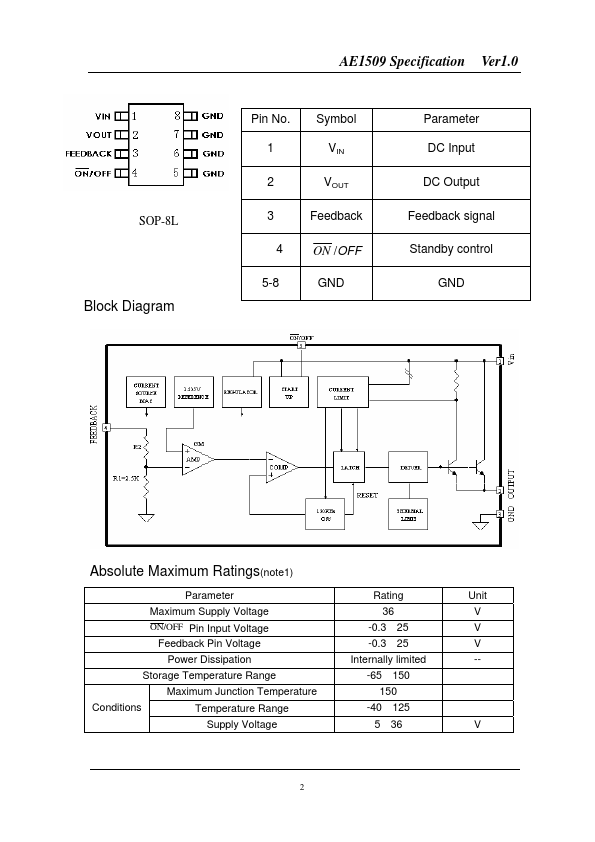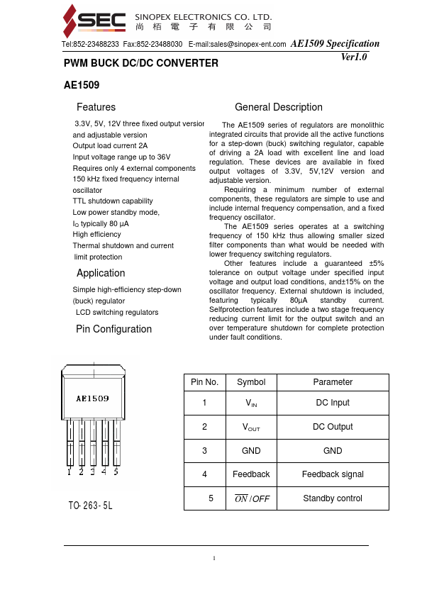 3.3V, 5V, 12V three fixed output versions The AE1509 series of regulators are monolithic and adjustable version integrated circuits that provide all the active functions Output load current 2A Input voltage range up to 36V Requires only 4 external ponents 150 kHz fixed frequency internal for a step-down (buck) switching regulator, capable of driving a 2A load with excellent line and load regulation. These devices...