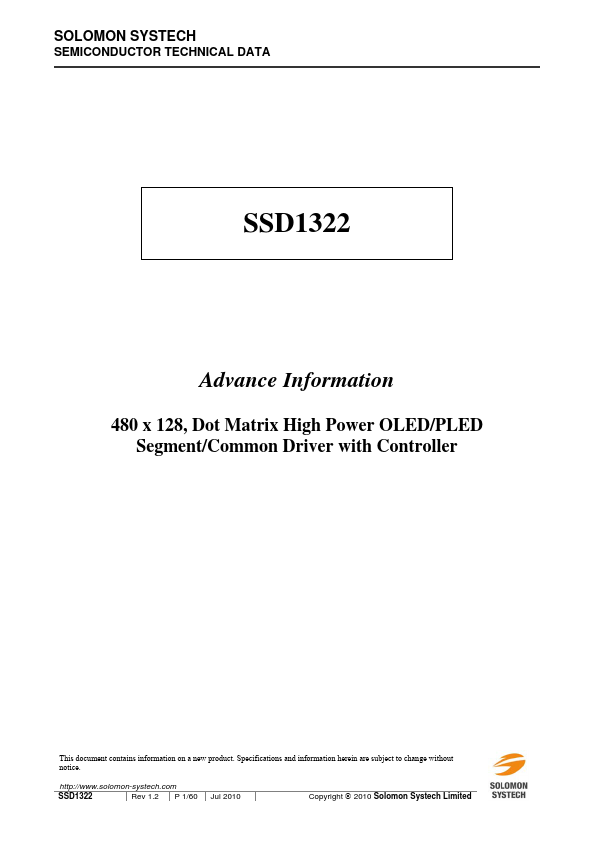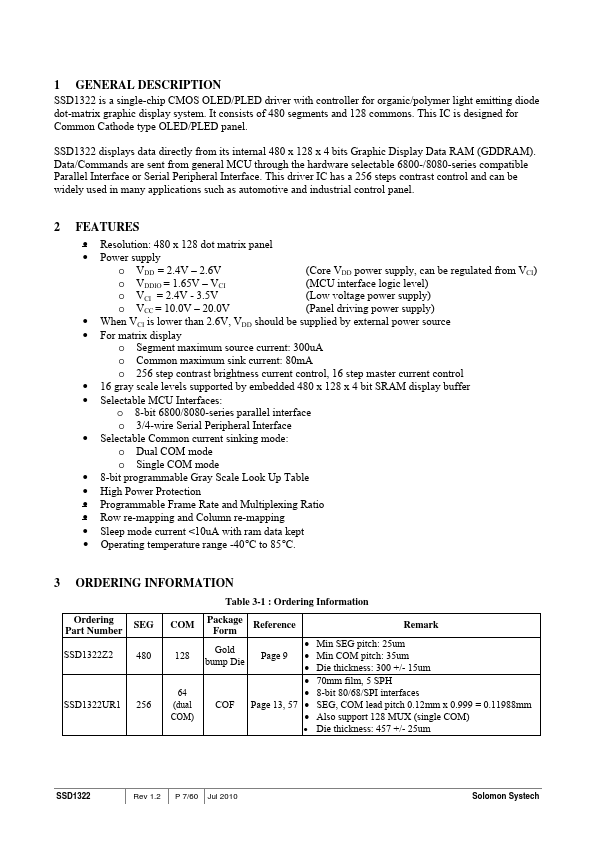 SSD1322 is a single-chip CMOS OLED/PLED driver with controller for organic/polymer light emitting diode dot-matrix graphic display system. It consists of 480 segments and 128 mons. This IC is designed for mon Cathode type OLED/PLED panel.