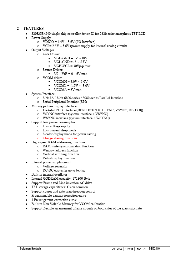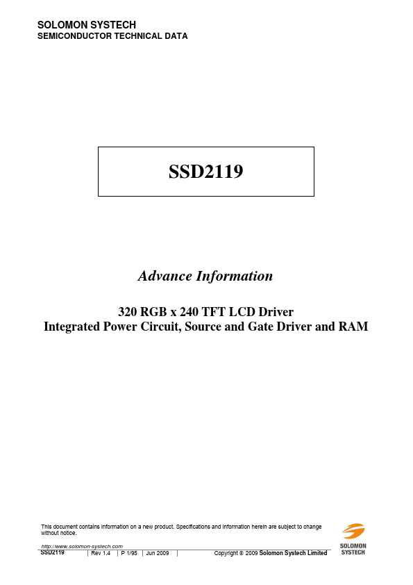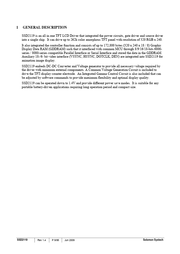 SSD2119 is an all in one TFT LCD Driver that integrated the power circuits, gate driver and source driver into a single chip. It can drive up to 262k color amorphous TFT panel with resolution of 320 RGB x 240. Auxiliary 18-/6- bit video interface (VSYNC, HSYNC, DOTCLK, DEN) are integrated into SSD2119 for animation image display.