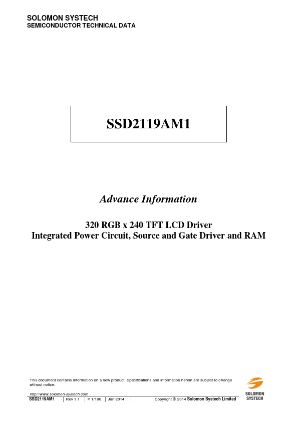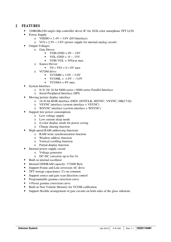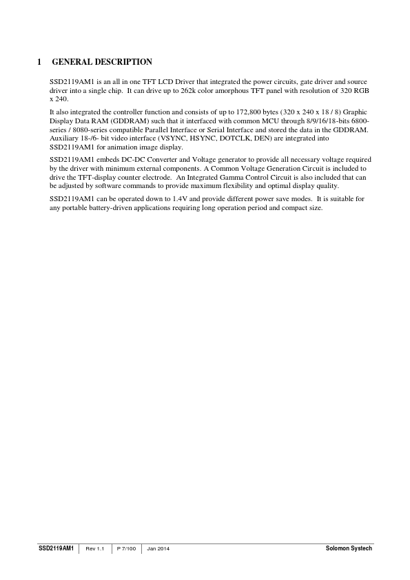SSD2119AM1 is an all in one TFT LCD Driver that integrated the power circuits, gate driver and source driver into a single chip. It can drive up to 262k color amorphous TFT panel with resolution of 320 RGB x 240. Auxiliary 18-/6- bit video interface (VSYNC, HSYNC, DOTCLK, DEN) are integrated into SSD2119AM1 for animation image display.