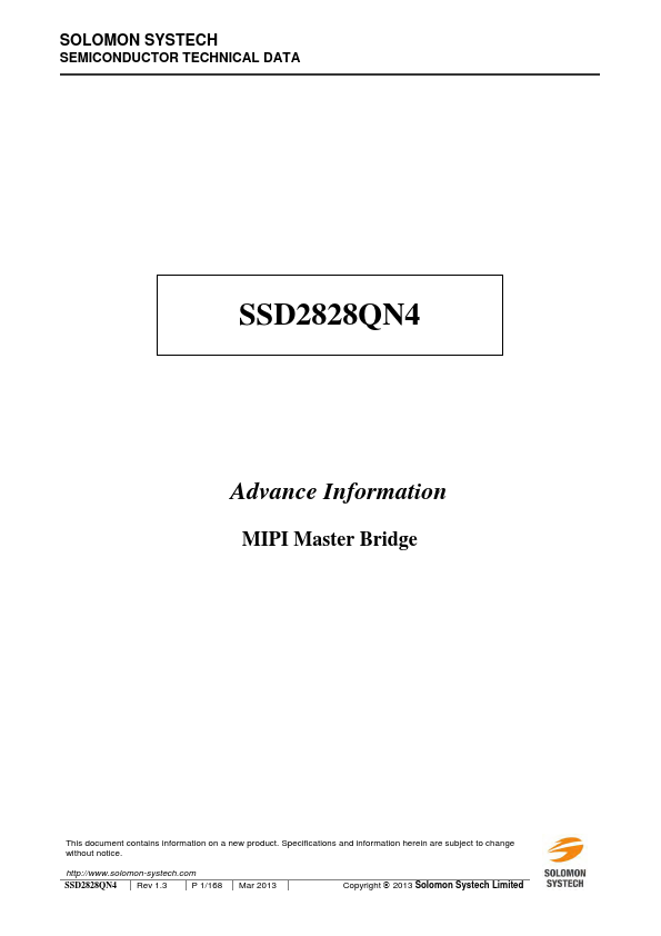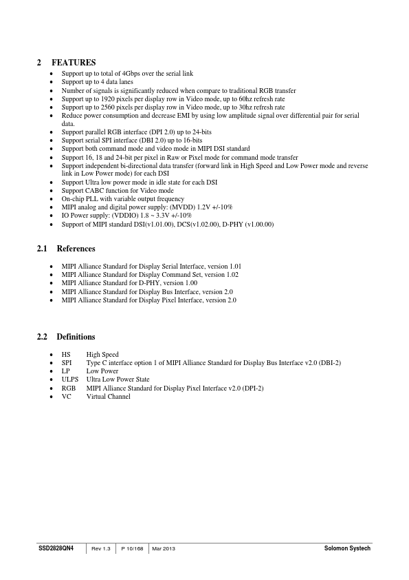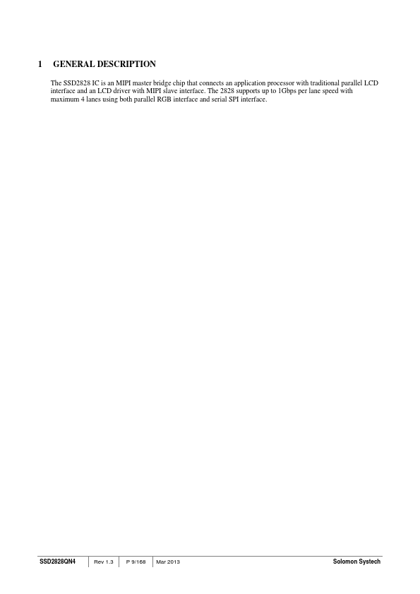 The SSD2828 IC is an MIPI master bridge chip that connects an application processor with traditional parallel LCD interface and an LCD driver with MIPI slave interface. The 2828 supports up to 1Gbps per lane speed with maximum 4 lanes using both parallel RGB interface and serial SPI interface. SSD2828QN4 Rev 1.3 P 9/168 Mar 2013 Solomon Systech.