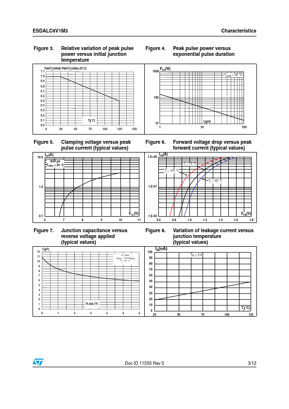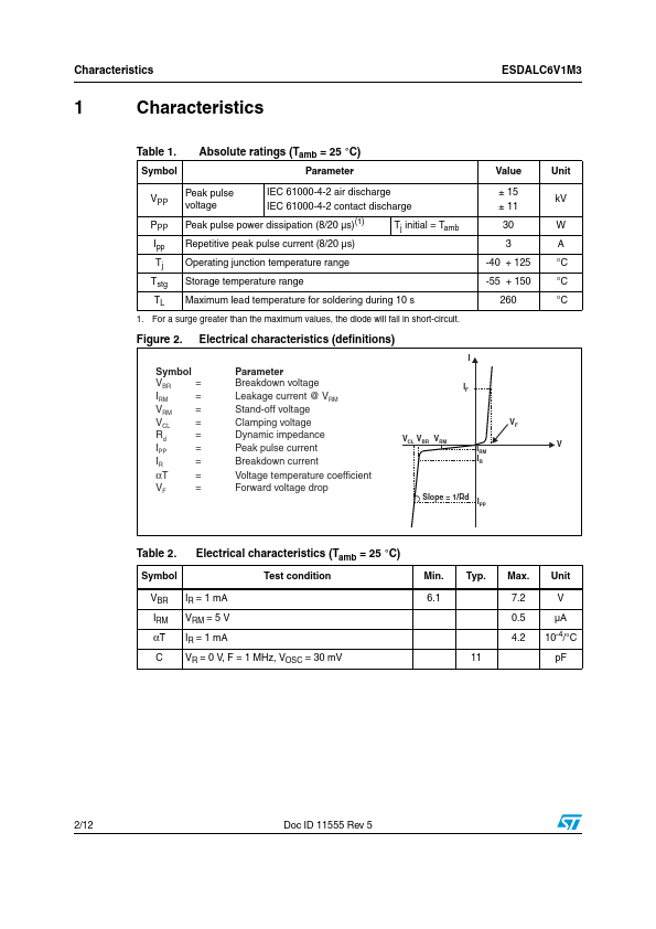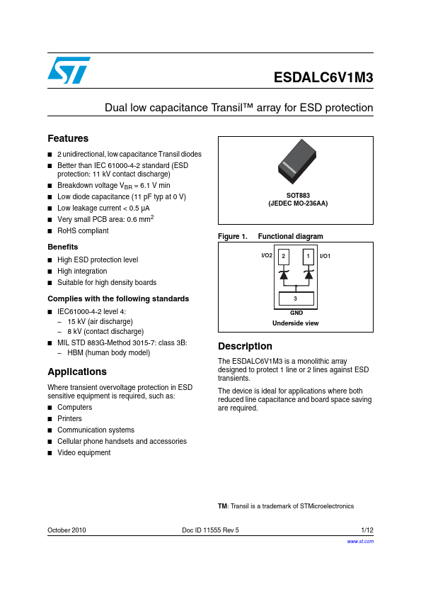 The ESDALC6V1M3 is a monolithic array designed to protect 1 line or 2 lines against ESD transients. The device is ideal for applications where both reduced line capacitance and board space saving are required. Transil is a trademark of STMicroelectronics Doc ID 11555 Rev 5 1/12 .st.