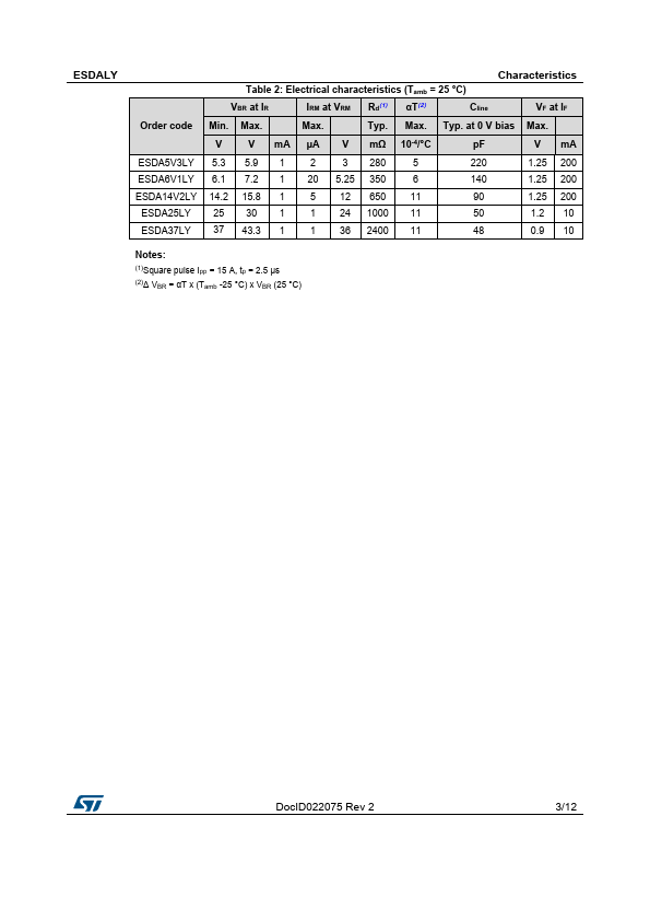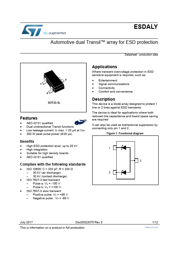 This device is a diode array designed to protect 1 line or 2 lines against ESD transients. The device is ideal for applications where both reduced line capacitance and board space saving are required It can also be used as bidirectional suppressor by connecting only pin 1 and 2. Functional diagram 1 3 2 July 2017 DocID022075 Rev 2 This is information on a product in full production.