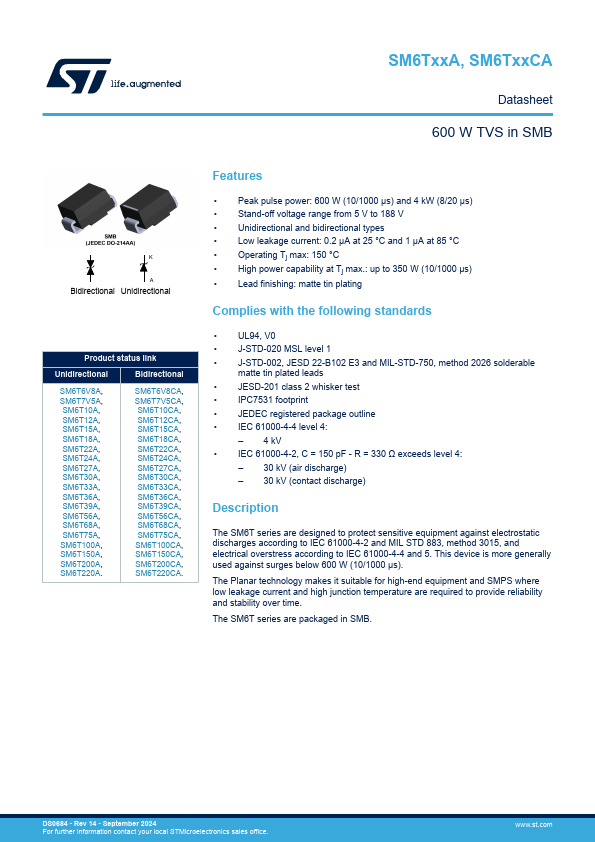 The SM6T series are designed to protect sensitive equipment against electrostatic discharges according to IEC 61000-4-2 and MIL STD 883, method 3015, and electrical overstress according to IEC 61000-4-4 and 5. This device is more generally used against surges below 600 W (10/1000 μs). The Planar technology makes it suitable for high-end equipment and SMPS where low leakage current and high junction temperature are...