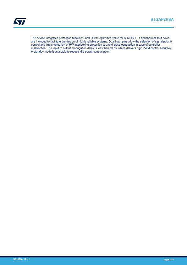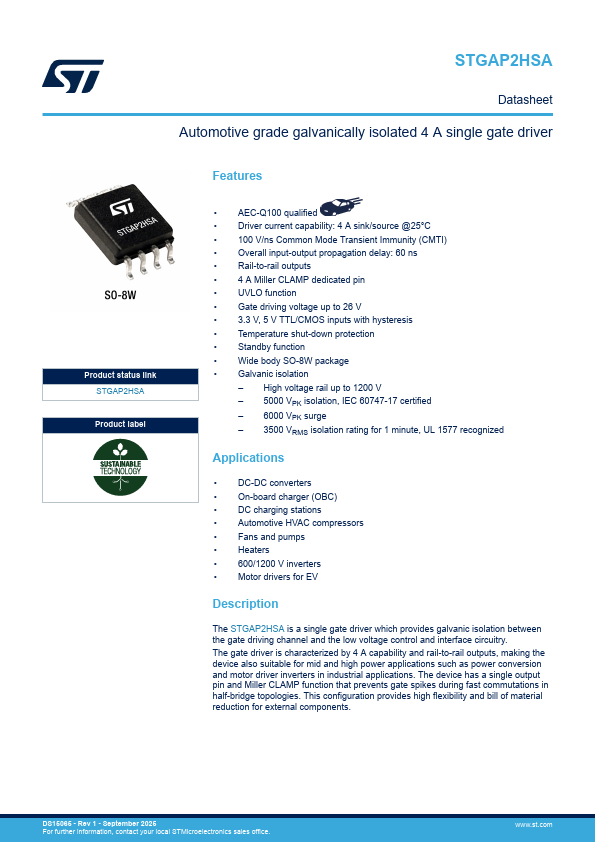 The STGAP2HSA is a single gate driver which provides galvanic isolation between the gate driving channel and the low voltage control and interface circuitry. The gate driver is characterized by 4 A capability and rail-to-rail outputs, making the device also suitable for mid and high power applications such as power conversion and motor driver inverters in industrial applications. The device has a single output pin...