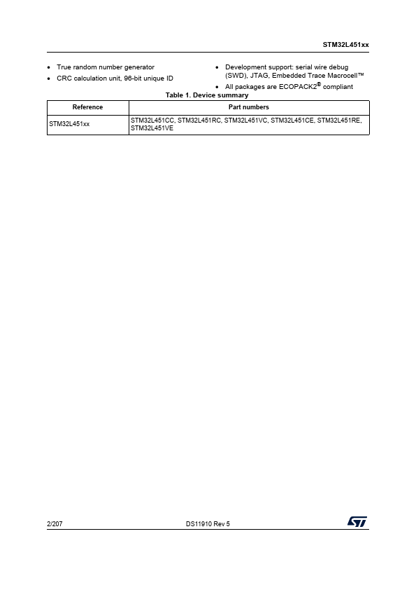 STM32L451xx Ultra-low-power Arm® Cortex®-M4 32-bit MCU+FPU, 100DMIPS, up to 512KB Flash, 160KB SRAM, analog, audio Datasheet - production data.