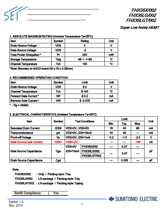 RATING (Ambient Temperature Ta=25℃) Item Symbol Rating Drain-Source Voltage VDS 4 Gate-Source Voltage VGS -3 Total Power Dissipation Pt Storage Temperature Tstg 290 -65 ~ +150 Channel Temperature Tch 150 Note: REMENDED OPERATING CONDITION Item Symbol Limit Unit Drain-Source Voltage VDS ≦3 V Channel Temperature Tch ≦ +80 ℃ Forward Gate Current IGF ≦ 0.2 mA Reverse Gate Current IGR ≧ -0.075 mA : Rg = 4000Ω 3. (Ambient...
