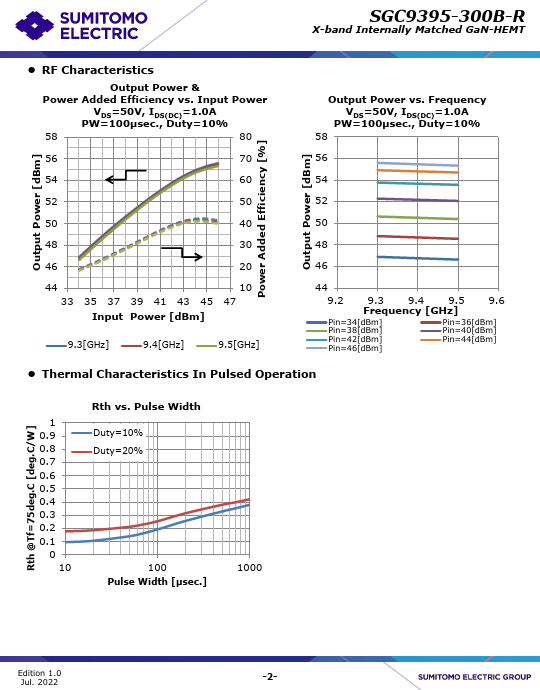 The SGC9395-300B-R is a high power GaN-HEMT that is internally matched for X-band radar bands to provide optimum power and gain in a 50ohm system. Psat Gp IDSR PAE Rth VDS=50V, IDS=20.0mA VDS=50V-typ. Duty=10% Pin=46dBm Channel to Case (Pdiss=100W,CW) Min.