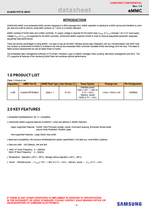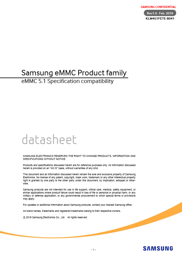 SAMSUNG CONFIDENTIAL Rev1.0. 2018 KLM4G1FETE-B041 Samsung eMMC Product family eMMC 5.1 Specification patibility datasheet SAMSUNG ELECTRONICS RESERVES THE RIGHT TO CHANGE PRODUCTS, INFORMATION AND SPECIFICATIONS WITHOUT NOTICE. Products and specifications discussed herein are for reference purposes only.
