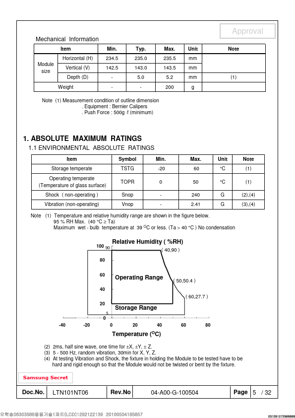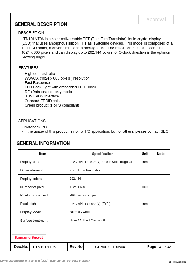 Approval DESCRIPTION LTN101NT06 is a color active matrix TFT (Thin Film Transistor) liquid crystal display (LCD) that uses amorphous silicon TFT as switching devices. This model is posed of a TFT LCD panel, a driver circuit and a backlight unit. The resolution of a 10.1" contains 1024 x 600 pixels and can display up to 262,144 colors.