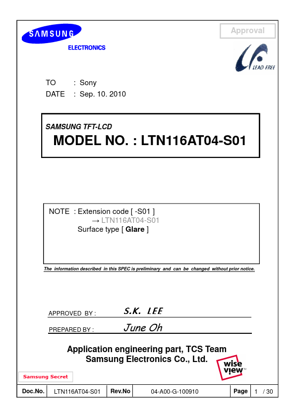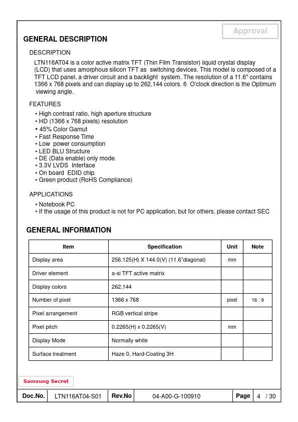 Approval DESCRIPTION LTN116AT04 is a color active matrix TFT (Thin Film Transistor) liquid crystal display (LCD) that uses amorphous silicon TFT as switching devices. This model is posed of a TFT LCD panel, a driver circuit and a backlight system. The resolution of a 11.6" contains 1366 x 768 pixels and can display up to 262,144 colors.