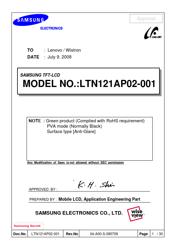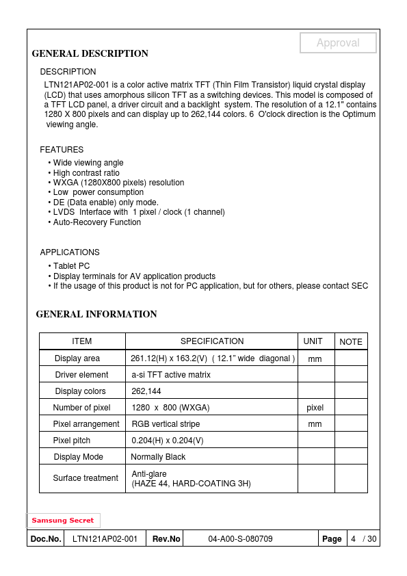 Approval DESCRIPTION LTN121AP02-001 is a color active matrix TFT (Thin Film Transistor) liquid crystal display (LCD) that uses amorphous silicon TFT as a switching devices. This model is posed of a TFT LCD panel, a driver circuit and a backlight system. The resolution of a 12.1" contains 1280 X 800 pixels and can display up to 262,144 colors.