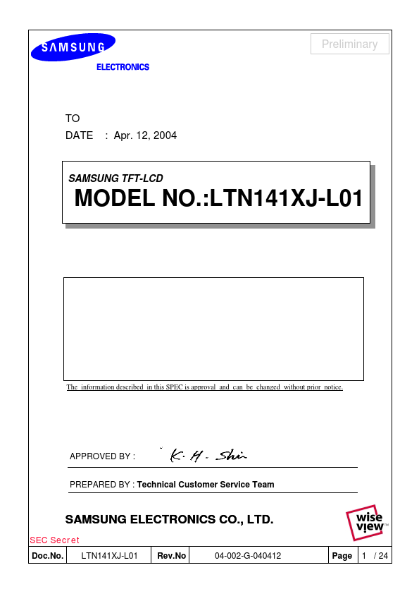Preliminary DESCRIPTION LTN141XJ-L01 is a color active matrix TFT (Thin Film Transistor) liquid crystal display (LCD) that uses amorphous silicon TFT as a switching devices. This model is posed of a TFT LCD panel, a driver circuit and a backlight system. The resolution of a 14.1" contains 1,024 x 768 pixels and can display up to 262,144 colors.