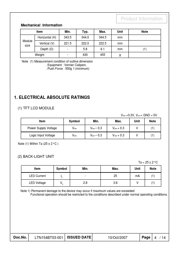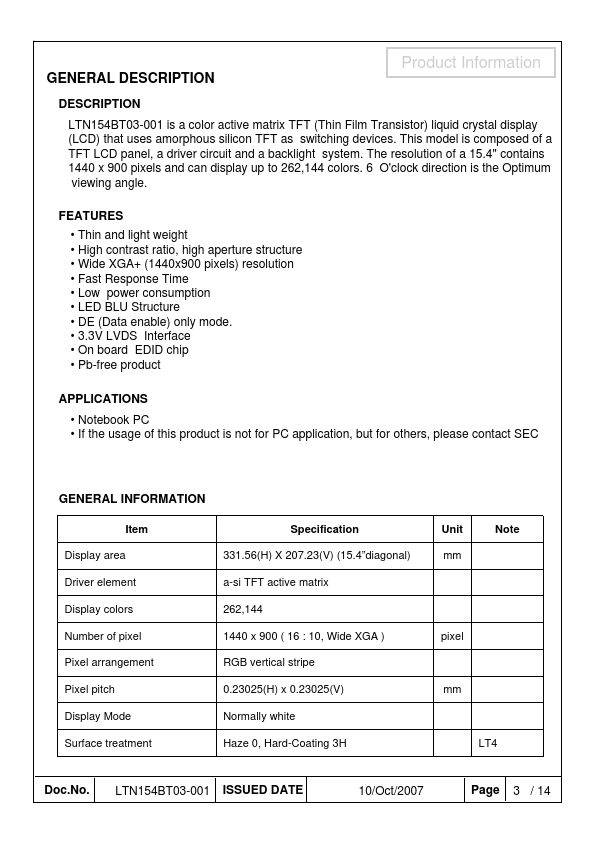 Product Information DESCRIPTION LTN154BT03-001 is a color active matrix TFT (Thin Film Transistor) liquid crystal display (LCD) that uses amorphous silicon TFT as switching devices. This model is posed of a TFT LCD panel, a driver circuit and a backlight system. The resolution of a 15.4" contains 1440 x 900 pixels and can display up to 262,144 colors.