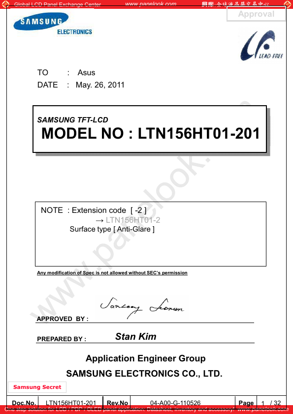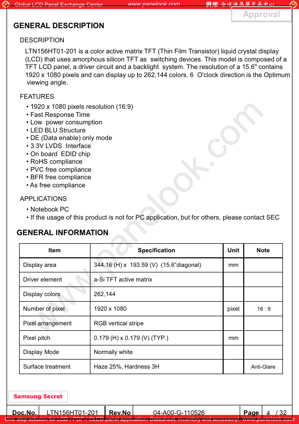 Approval DESCRIPTION LTN156HT01-201 is a color active matrix TFT (Thin Film Transistor) liquid crystal display (LCD) that uses amorphous silicon TFT as switching devices. This model is posed of a TFT LCD panel, a driver circuit and a backlight system. The resolution of a 15.6" contains 1920 x 1080 pixels and can display up to 262,144 colors.