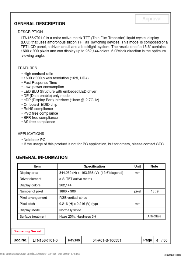 Approval DESCRIPTION LTN156KT01-0 is a color active matrix TFT (Thin Film Transistor) liquid crystal display (LCD) that uses amorphous silicon TFT as switching devices. This model is posed of a TFT LCD panel, a driver circuit and a backlight system. The resolution of a 15.6" contains 1600 x 900 pixels and can display up to 262,144 colors.