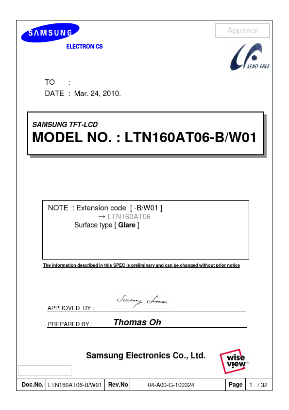 Approval DESCRIPTION LTN160AT06-A01 is a color active matrix TFT (Thin Film Transistor) liquid crystal display (LCD) that uses amorphous silicon TFT as switching devices. This model is posed of a TFT LCD panel, a driver circuit and a backlight unit. The resolution of a 16.0" contains 1366 x 768 pixels and can display up to 262,144 colors.