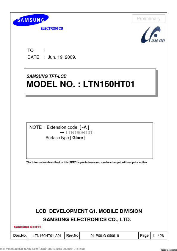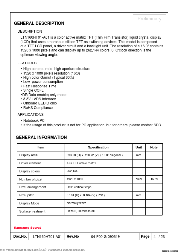 Preliminary DESCRIPTION LTN160HT01-A01 is a color active matrix TFT (Thin Film Transistor) liquid crystal display (LCD) that uses amorphous silicon TFT as switching devices. This model is posed of a TFT LCD panel, a driver circuit and a backlight unit. The resolution of a 16.0" contains 1920 x 1080 pixels and can display up to 262,144 colors.
