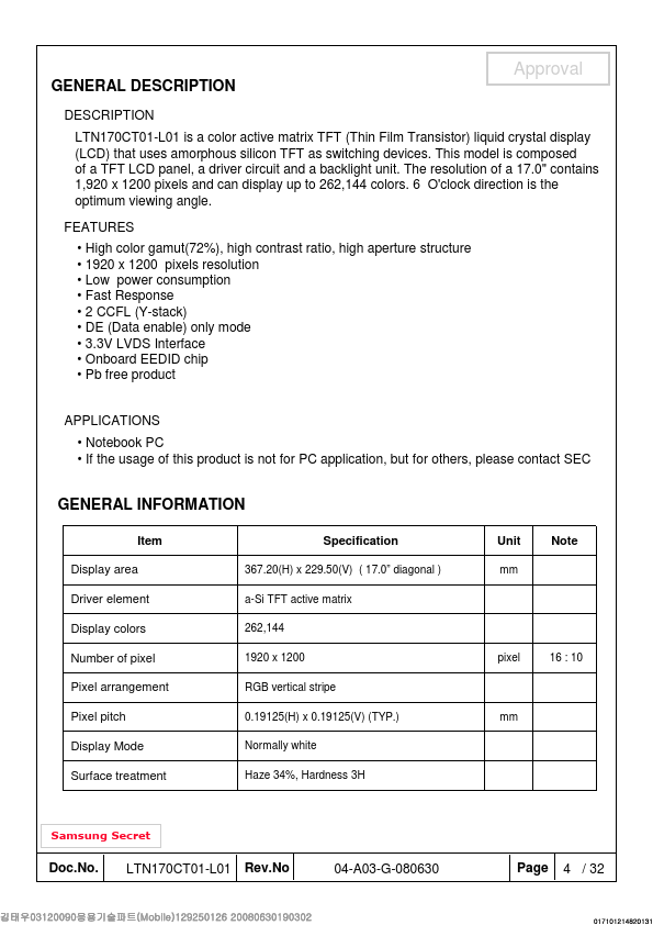 Approval DESCRIPTION LTN170CT01-L01 is a color active matrix TFT (Thin Film Transistor) liquid crystal display (LCD) that uses amorphous silicon TFT as switching devices. This model is posed of a TFT LCD panel, a driver circuit and a backlight unit. The resolution of a 17.0" contains 1,920 x 1200 pixels and can display up to 262,144 colors.