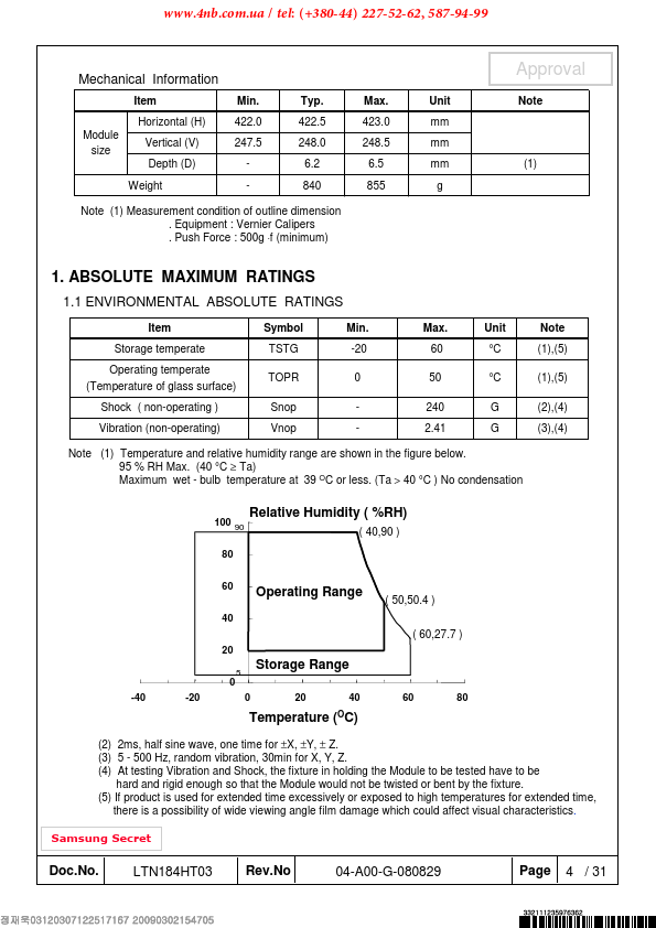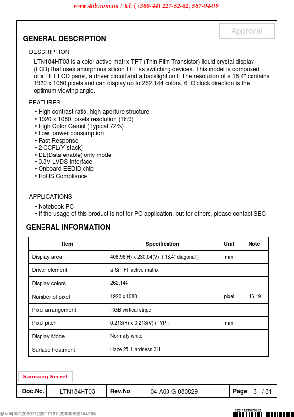Approval DESCRIPTION LTN184HT03 is a color active matrix TFT (Thin Film Transistor) liquid crystal display (LCD) that uses amorphous silicon TFT as switching devices. This model is posed of a TFT LCD panel, a driver circuit and a backlight unit. The resolution of a 18.4" contains 1920 x 1080 pixels and can display up to 262,144 colors.