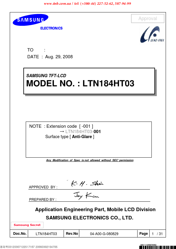 Approval DESCRIPTION LTN184HT03 is a color active matrix TFT (Thin Film Transistor) liquid crystal display (LCD) that uses amorphous silicon TFT as switching devices. This model is posed of a TFT LCD panel, a driver circuit and a backlight unit. The resolution of a 18.4" contains 1920 x 1080 pixels and can display up to 262,144 colors.