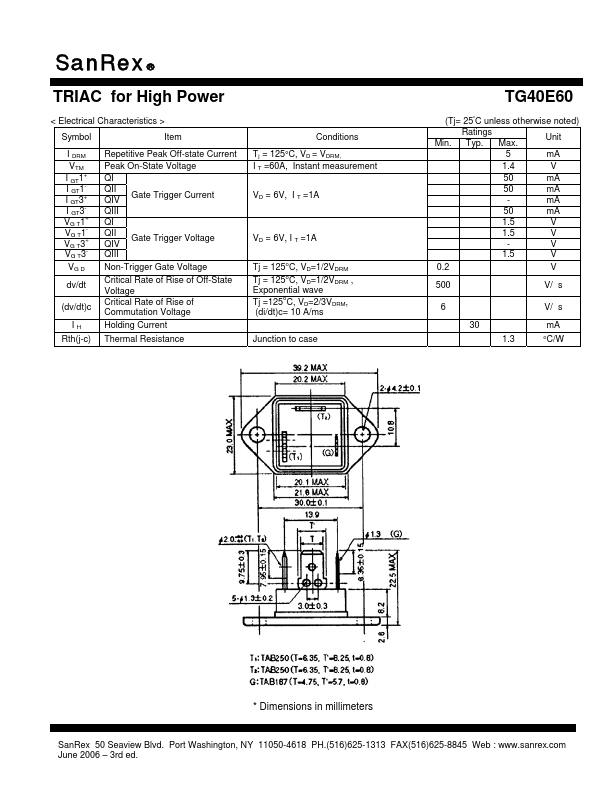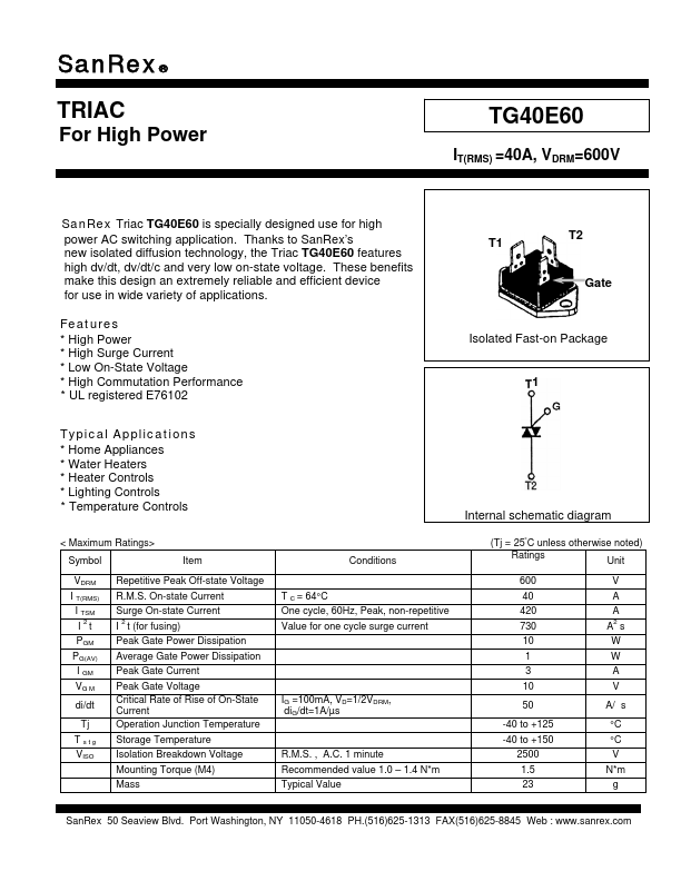 SanRex® TRIAC For High Power TG40E60 IT(RMS) =40A, VDRM=600V SanRex Triac TG40E60 is specially designed use for high power AC switching application. Thanks to SanRex’s new isolated diffusion technology, the Triac TG40E60.