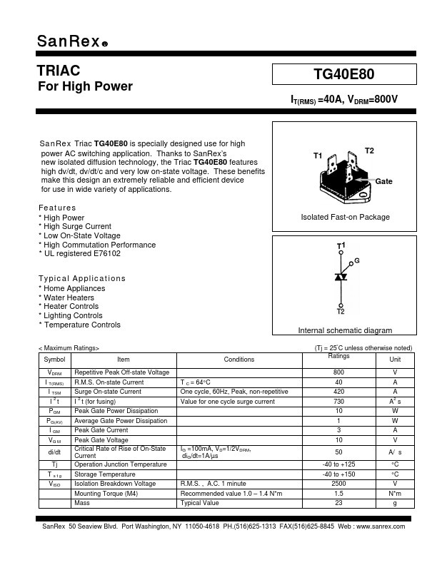 SanRex® TRIAC For High Power TG40E80 IT(RMS) =40A, VDRM=800V SanRex Triac TG40E80 is specially designed use for high power AC switching application. Thanks to SanRex’s new isolated diffusion technology, the Triac TG40E80.