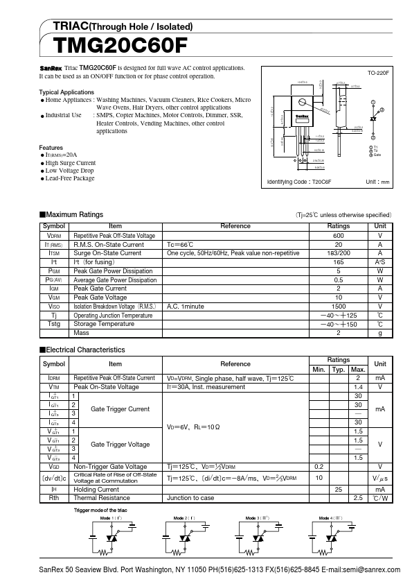 TRIAC(Through Hole / Isolated) TMG20C60F Triac TMG20C60F is designed for full wave AC control applications. It can be used as an ON/OFF function or for phase control operation. Typical Applications ˔ Home Appliances.