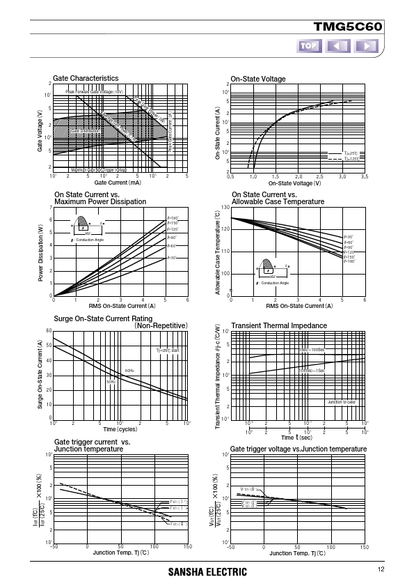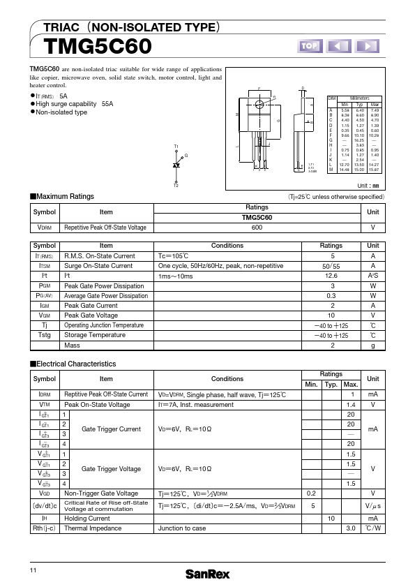 TRIACʢNON-ISOLATED TYPEʣ TMG5C60 TMG5C60 are non-isolated triac suitable for wide range of applications like copier, microwave oven, solid state switch, motor control, light and heater control. measurement VDʹ6VɼRLʹ10Њ VDʹ6VɼRLʹ10Њ Tjʹ125ˆɼVDʹ1ʗ2VDRM Tjʹ125ˆɼʤdi/dtʥcʹʵ2.5A/msɼVDʹ2ʗ3VDRM Junction to case Ratings Unit Min.