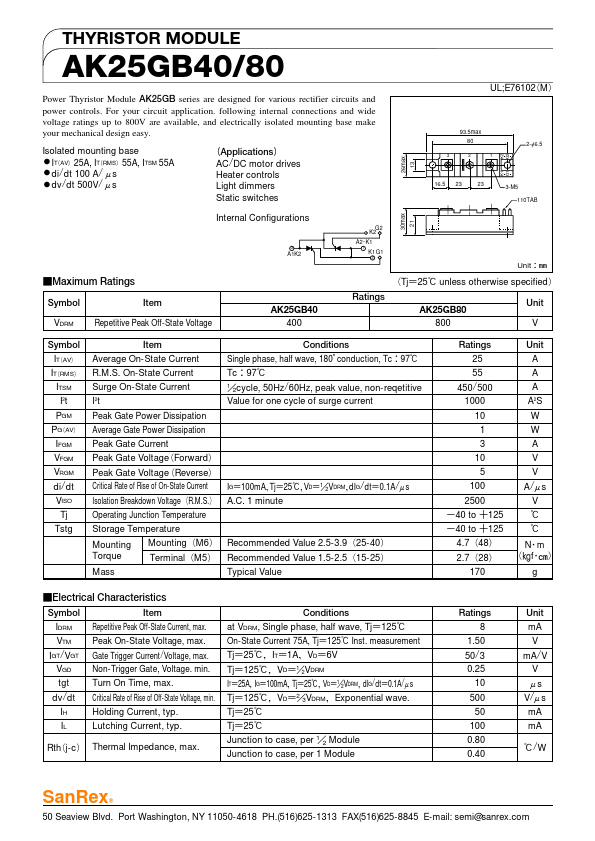 THYRISTOR MODULE AK25GB40/80 Power Thyristor Module AK25GB series are designed for various rectifier circuits and power controls. For your circuit application. following internal connections and wide voltage ratings up to 800V are available, and electrically isolated mounting base make your mechanical design easy.
