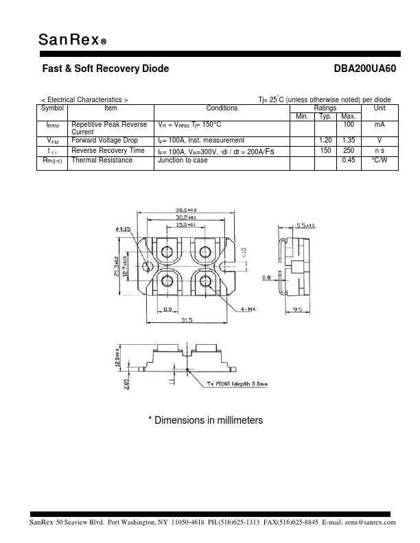 SanRex® Fast & Soft Recovery Diode DBA200UA60 IF(AV)= 2x100A, VRRM=600V, trr=150ns SanRex Fast & Soft Recovery Diode Module DBA200UA60 is designed for applications requiring fast switching and soft recovery wave shape to reduce or eliminate the need for snubber ponents in the circuit. The modules are isolated for easy mounting with other ponents or a mon heatsink.