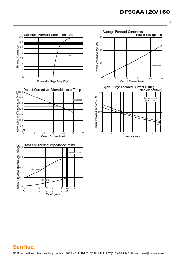 DIODE (THREE PHASES BRIDGE TYPE) DF50AA120/160 Power Diode Module DF50AA is designed for three phase full wave rectification, which has six diodes connected in a three phase bridge configuration. The mounting base of the module is electrically isolated from semiconductor elements for simple heatsink construction Output DC current is 50Amp ʢTcʹ114ˆʣ Repetitive peak reverse voltage is up to 1,600V. TCɿ114ˆ Surge...