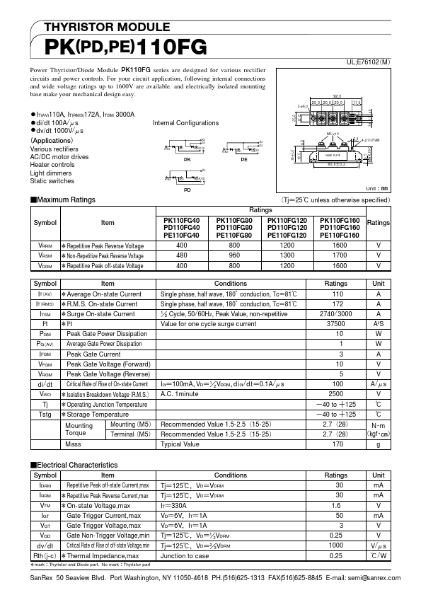 THYRISTOR MODULE PK(PD,PE)110FG Power Thyristor/Diode Module PK110FG series are designed for various rectifier circuits and power controls. For your circuit application, following internal connections and wide voltage ratings up to 1600V are available. and electrically isolated mounting base make your mechanical design easy.