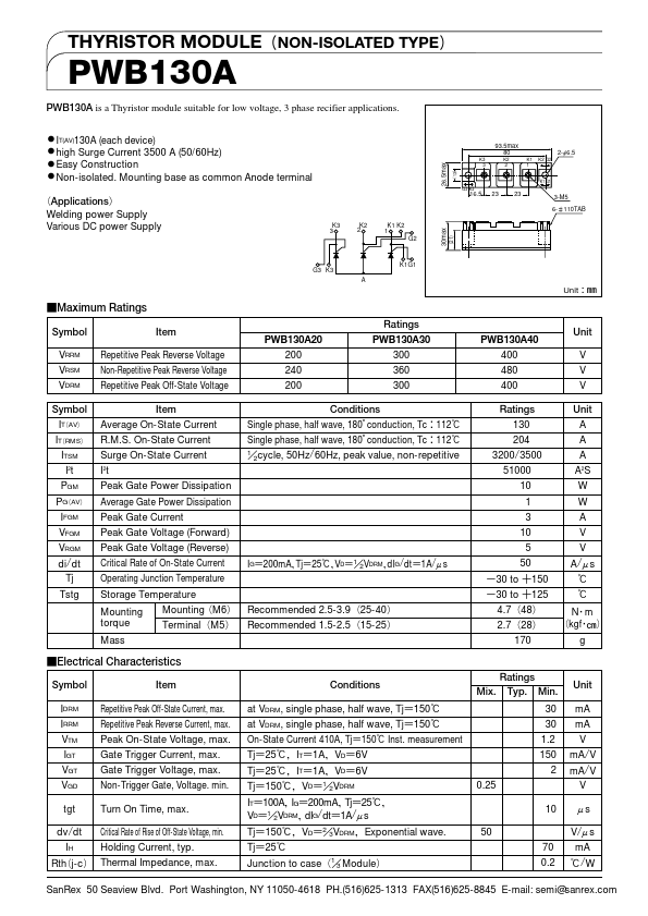 THYRISTOR MODULEʢNON-ISOLATED TYPEʣ PWB130A PWB130A is a Thyristor module suitable for low voltage, 3 phase recifier applications. ˔ IT(AV)130A (each device) ˔ high Surge Current 3500 A (50/60Hz) ˔ Easy Construction ˔ Non-isolated. IRRM Repetitive Peak Reverse Current, max.