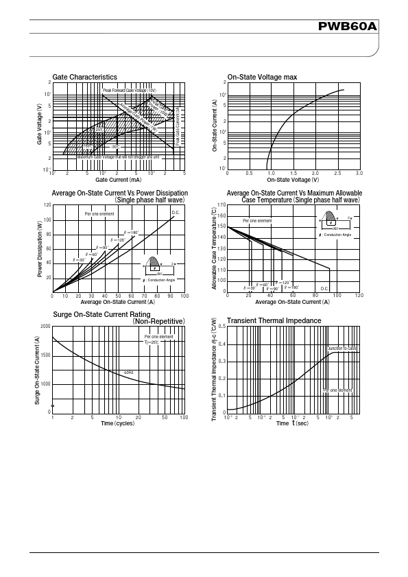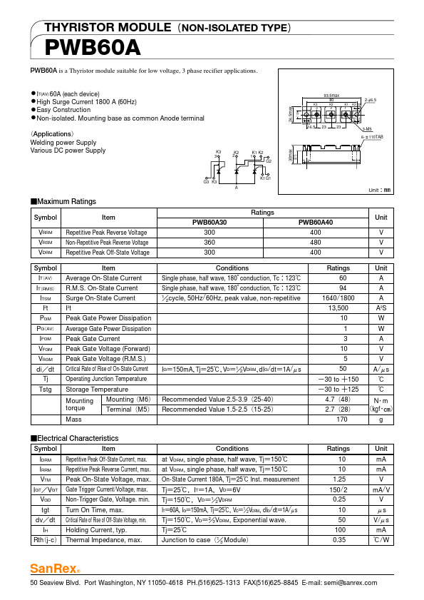 THYRISTOR MODULEʢNON-ISOLATED TYPEʣ PWB60A PWB60A is a Thyristor module suitable for low voltage, 3 phase recifier applications. ˔ IT(AV) 60A (each device) ˔ High Surge Current 1800 A (60Hz) ˔ Easy Construction ˔ Non-isolated. IRRM Repetitive Peak Reverse Current, max.
