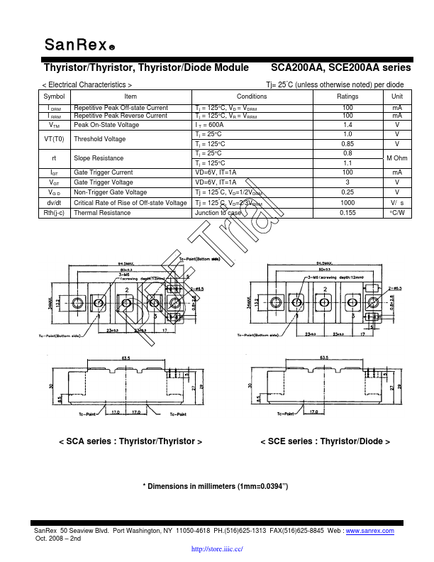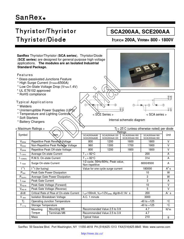 SanRex® Thyristor/Thyristor Thyristor/Diode SCA200AA, SCE200AA IT(AV)= 200A, VRRM= 800 - 1800V SanRex Thyristor/Thyristor (SCA series), Thyristor/Diode (SCE series) are designed for general purpose high voltage applications. The modules are an Isolated Industrial Standard Package.