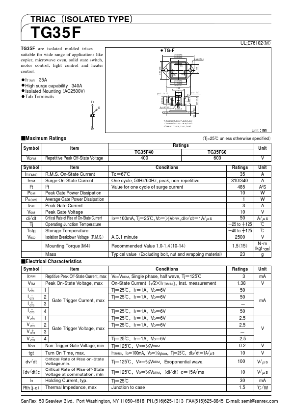 TRIACʢISOLATED TYPEʣ TG35F TG35F are isolated molded triacs suitable for wide range of applications like copier, microwave oven, solid state switch, motor control, light control and heater control. dv/dt ʤdv/dtʥc IH Critical Rate of Rise on-State Voltage,min. Critical Rate of Rise off-State Voltage at mutation, min Holding Current, typ.
