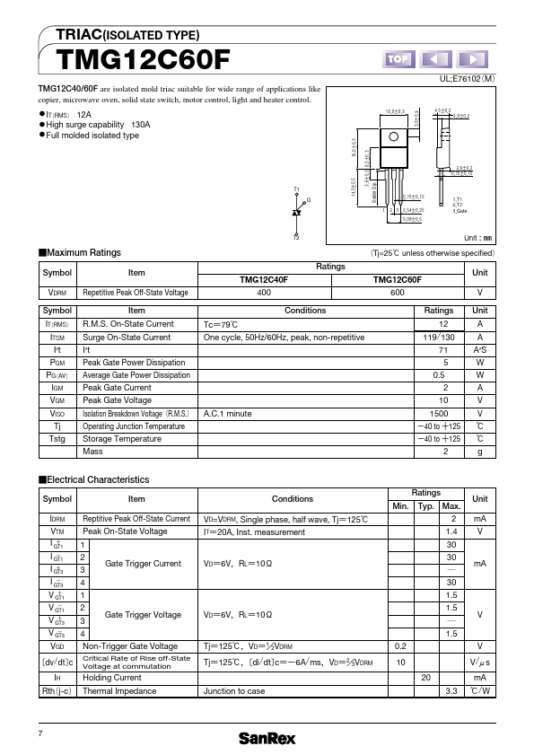 TMG12C40/60F are isolated mold triac suitable for wide range of applications like copier, microwave oven, solid state switch, motor control, light and heater control.