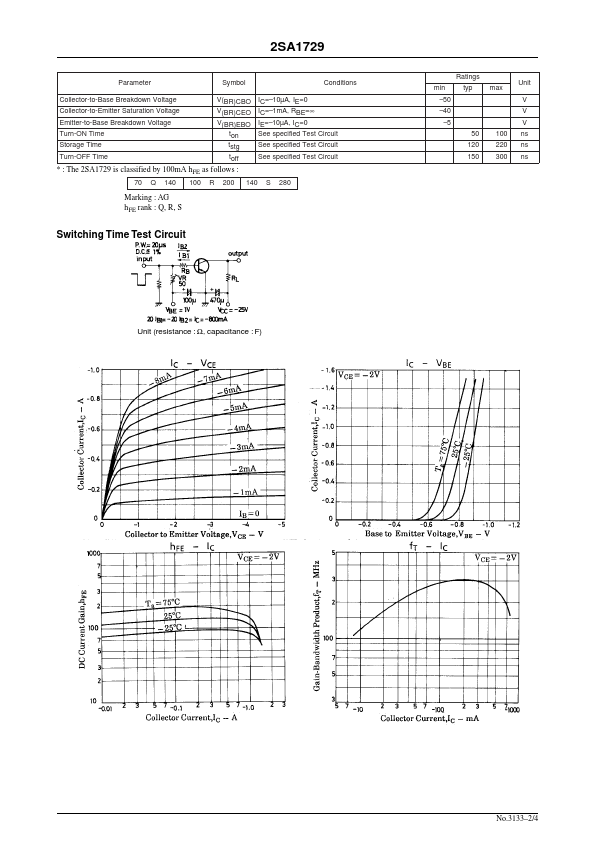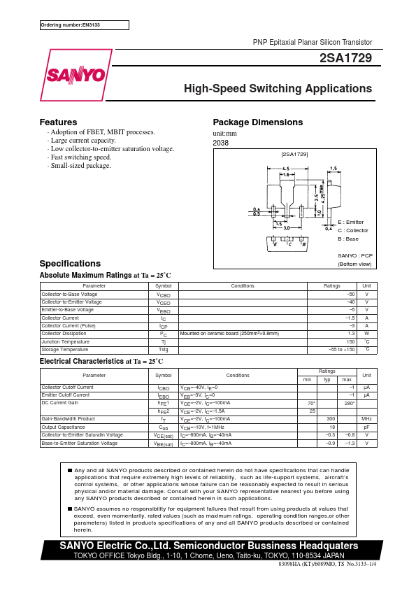 Ordering number:EN3133 PNP Epitaxial Planar Silicon Transistor 2SA1729 High-Speed Switching Applications.