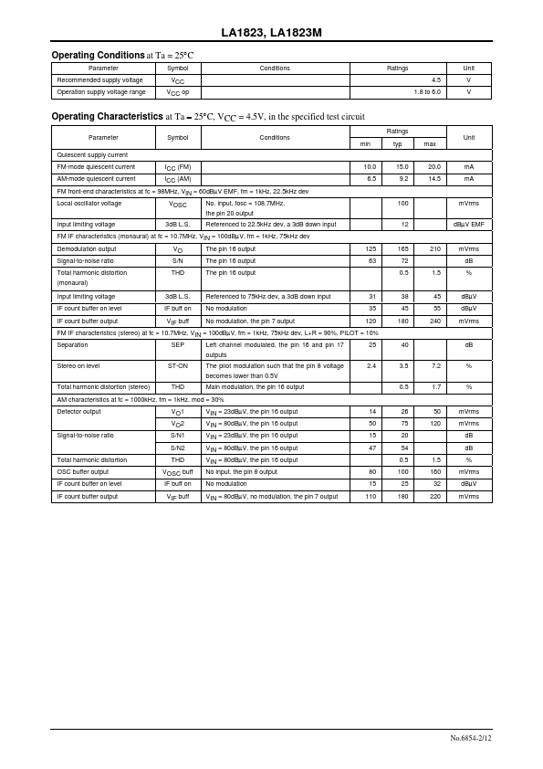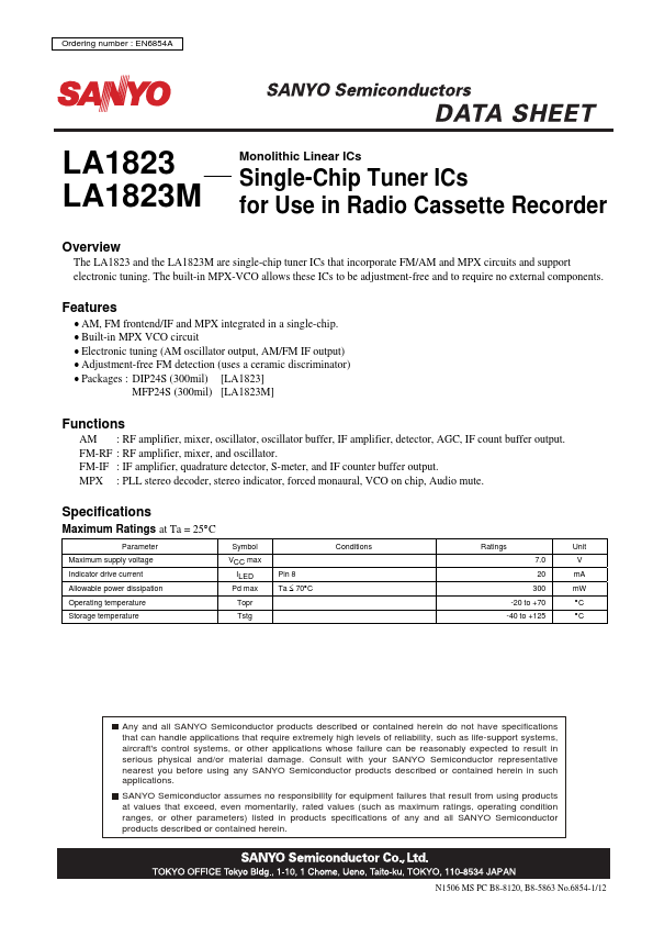 EN6854A LA1823 LA1823M Monolithic Linear ICs Single-Chip Tuner ICs for Use in Radio Cassette Recorder Overview The LA1823 and the LA1823M are single-chip tuner ICs that incorporate FM/AM and MPX circuits and support electronic tuning. The built-in MPX-VCO allows these ICs to be adjustment-free and to require no external ponents.