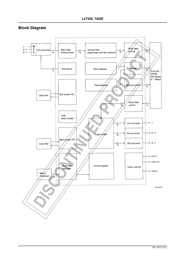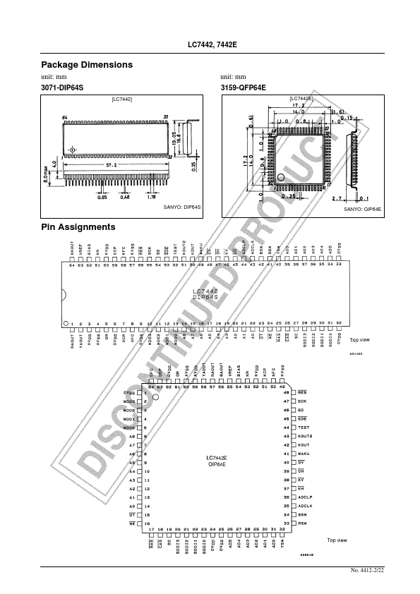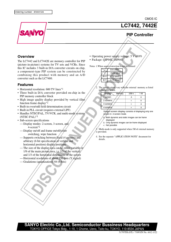 EN4412A CMOS IC LC7442, 7442E PIP Controller Overview The LC7442 and LC7442E are memory controller for PIP (picture-in-picture) systems for TV sets and VCRs. Since this IC includes 3 built-in D/A converter circuits on chip, a ponent-type PIP system can be constructed by bining this product with memory and an A/D converter such as the LC7480.