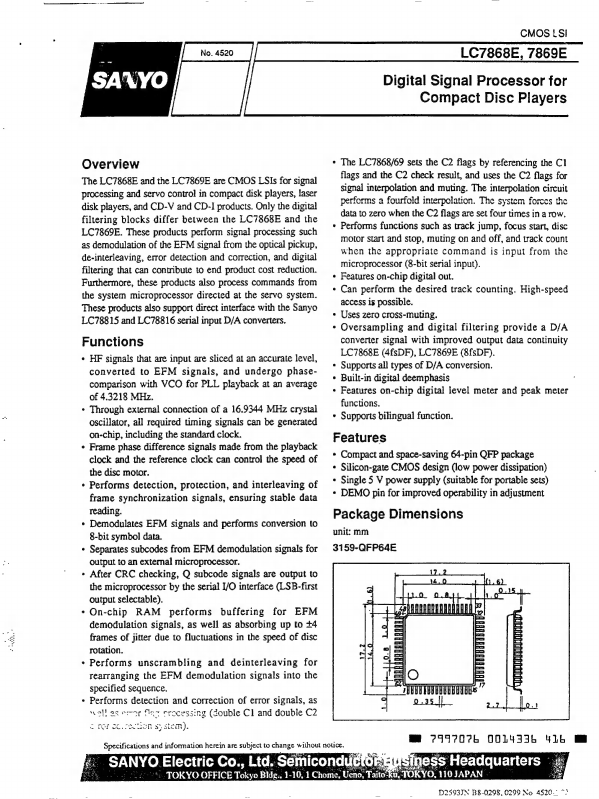 CMOS LSI LC7868E, 7869E Digital Signal Processor for pact Disc Players Overview The LC7868E and the LC7869E are CMOS LSIs for signal processing and servo control in pact disk players, laser disk players, and CD-V and CD-I products. Only the digital filtering blocks differ between the LC7868E and the LC7869E. These products perform signal processing such as demodulation of the EFM signal from the optical pickup,...