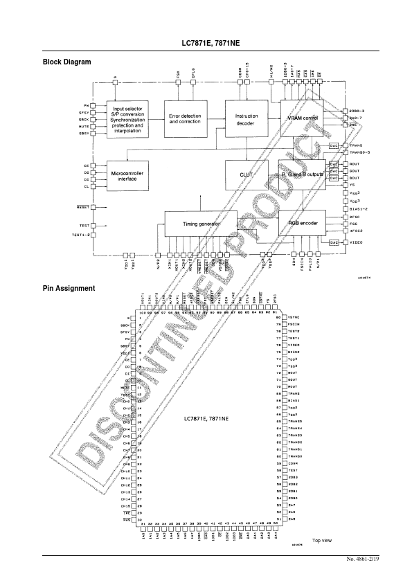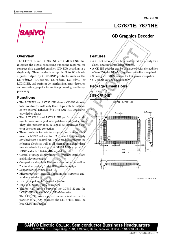EN4861 CMOS LSI LC7871E, 7871NE CD Graphics Decoder Overview The LC7871E and LC7871NE are CMOS LSIs that integrate the signal processing functions required for pact disk extended graphics (CD-EG) decoding in a single chip. These products accept the R to W subcode signals output by CDP-DSP products such as the LC7860KA, LC7867E, LC7868E, LC7869E, or LC78681E, and perform de-interleaving, error detection and...