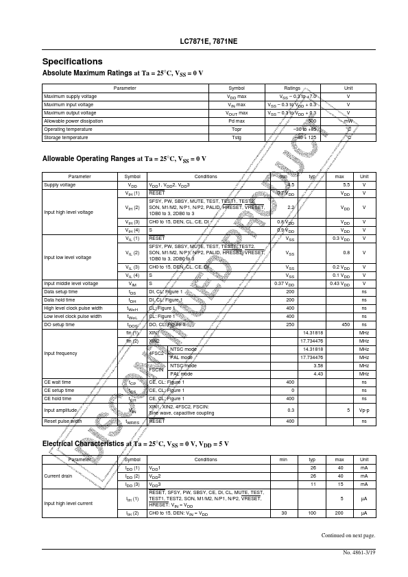 EN4861 CMOS LSI LC7871E, 7871NE CD Graphics Decoder Overview The LC7871E and LC7871NE are CMOS LSIs that integrate the signal processing functions required for pact disk extended graphics (CD-EG) decoding in a single chip. These products accept the R to W subcode signals output by CDP-DSP products such as the LC7860KA, LC7867E, LC7868E, LC7869E, or LC78681E, and perform de-interleaving, error detection and...