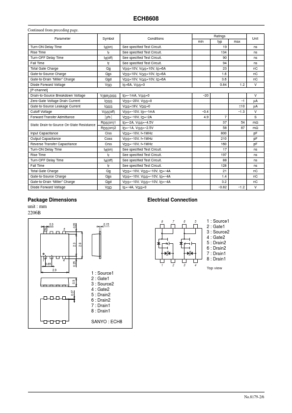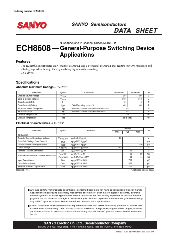 ENN8179 ECH8608 ECH8608 N-Channel and P-Channel Silicon MOSFETs General-Purpose Switching Device Applications.