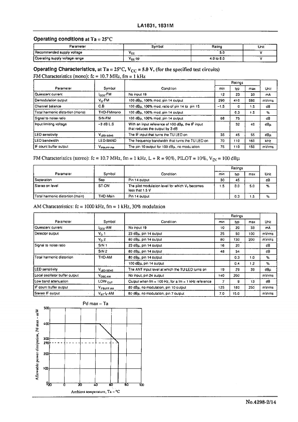 EN«98A JSAYO No.4298A Monolithic Linear IC LA1831,1831M Support for AM Stereo and Electronic Tuning Singie Chip Music C e n t e r l C (AM/FM IF + MPX) for Use in pact Radio/Casette Products Overview The LA1831 is a single chip AM/FM IF and MPX tuner IC that supports electronic tuning. This chip was developed for consumer audio systems and is optimal for auto-seek systems based on IF count methods used together with...