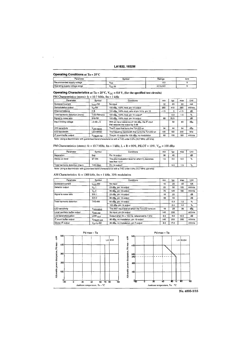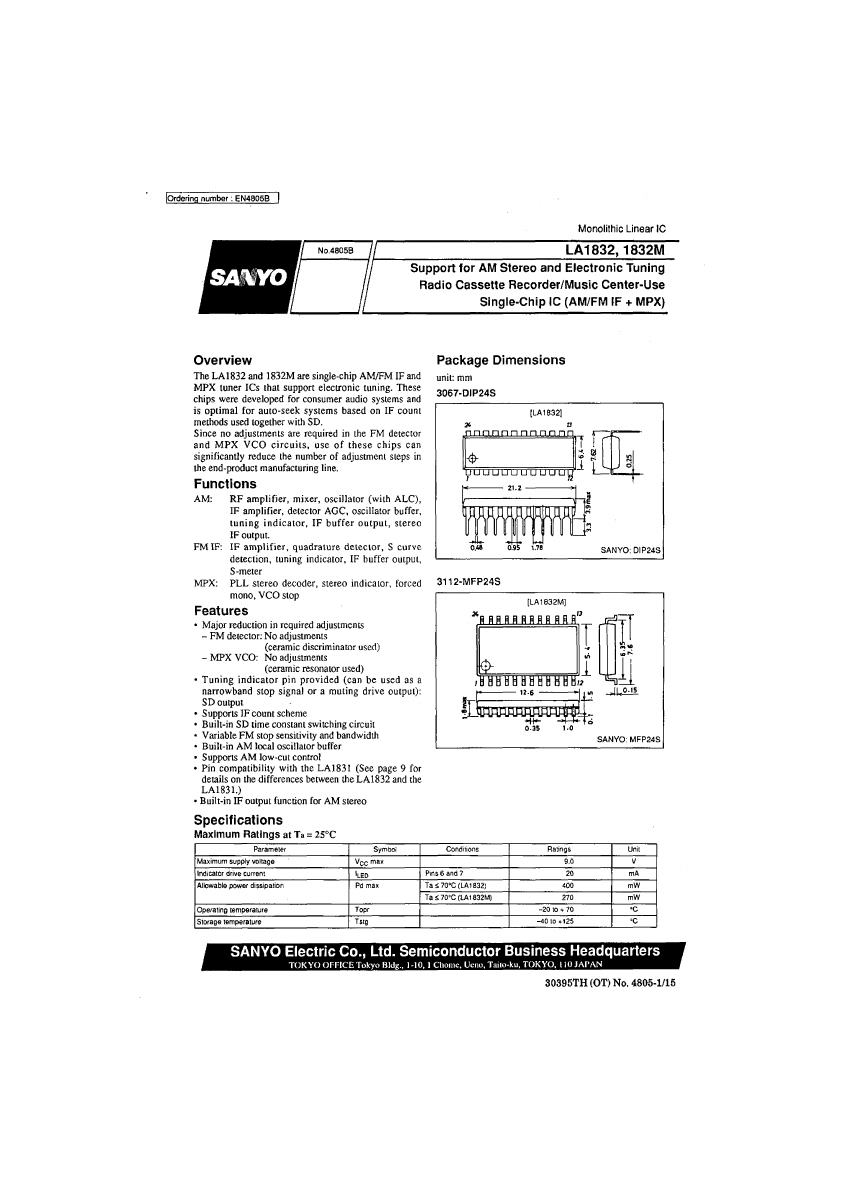 EN4805B | NO.4B05B isArno Monolithic Linear IC LA1832,1832M Support for AM Stereo and Electronic Tuning Radio Cassette Recorder/Music Center-Use Single-Chip IC (AM/FM IF + MPX) Overview Package Dimensions The LA 1832 and 1832M are single-chip AM/FM IF and MPX tuner ICs that support electronic tuning. These chips were developed for consumer audio systems and is optimal for auto-seek systems based on IF count methods...